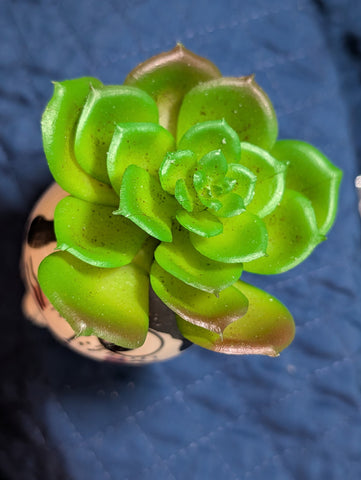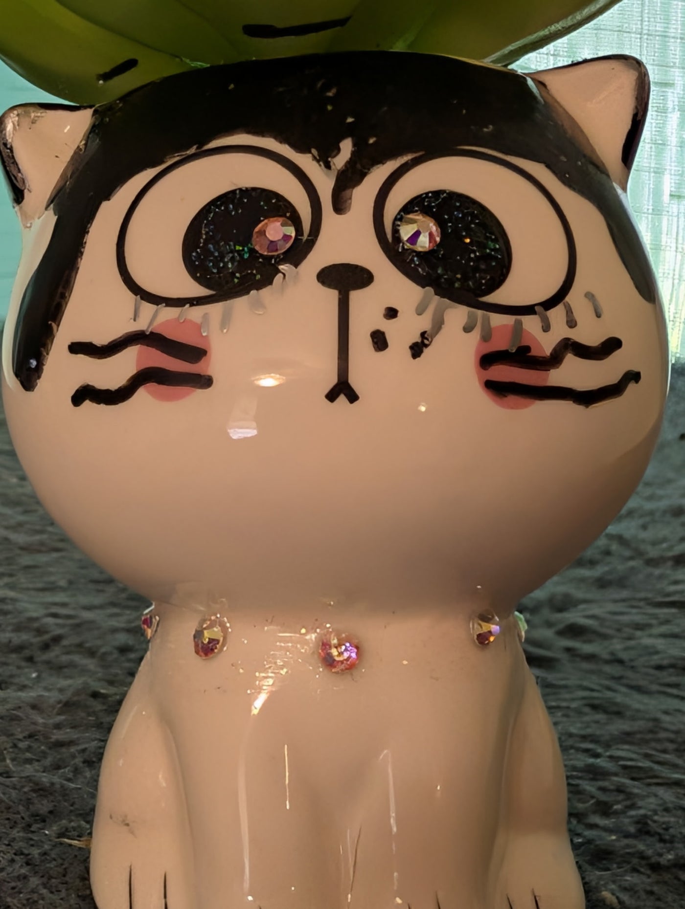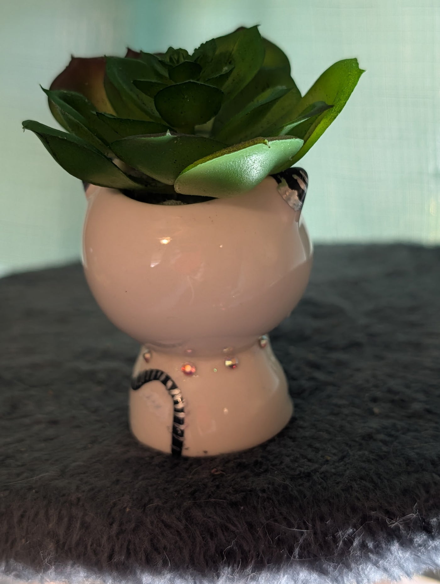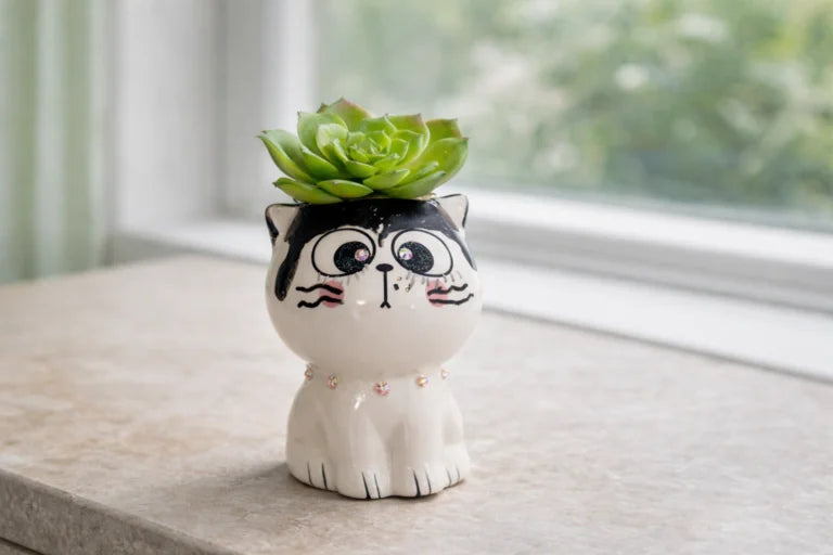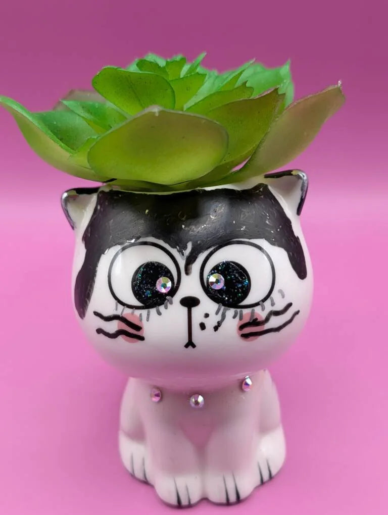 Adorable smooth white ceramic cat with black bangs; sparkling eyes match his crystal collar; planter containing a beautiful faux green succulent exploding from the top of the vessel. This 4" tall planter will compliment any space including desktops, shelves, windowsills or could be a perfect gift. This cute planter can enhance any cat lover's collection or brighten up any collection,