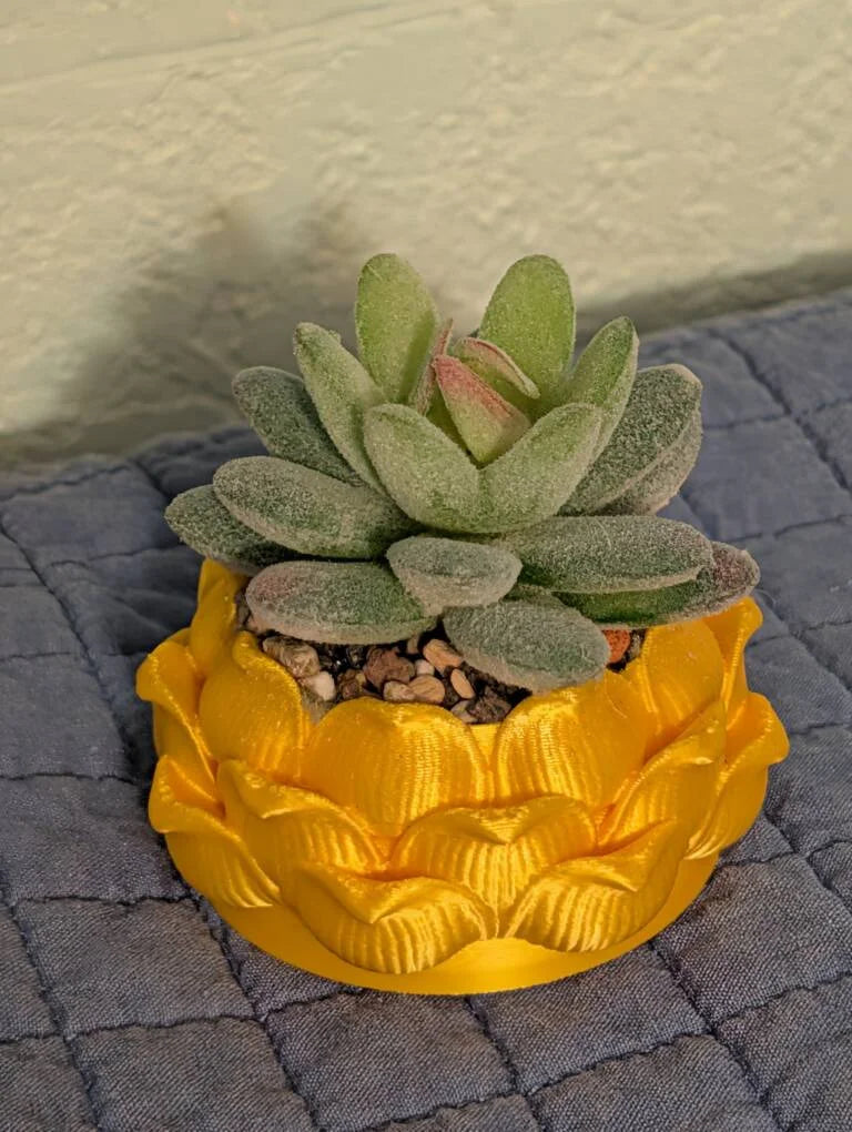 The textured golden base mimics layered lotus petals, creating a sculptural look that feels both modern and serene. Perfect for desks, shelves, nightstands, or gifting, this arrangement offers all the beauty of greenery - without the maintenance. A charming accent for home decor lovers who want something unique, uplifting, and effortlessly stylish.